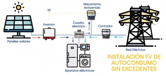 La energía eléctrica generada por la instalación se consume en el mismo punto en el que se encuentra la instalación evitándonos la dependencia de la red.