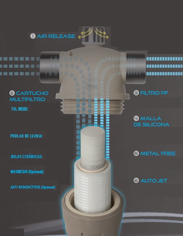 (Patente única en el mundo) Libera aire y gases derivados del oxígeno (O2), elimina bacterias aerobias y virus en el filtro. Evita gases radioactivos dispersos en el aire, elimina la corrosión de los accesorios de cobre y latón, por lo tanto, no hay descomposición de plomo en el agua. Elimina el CO3 eliminando incrustaciones.